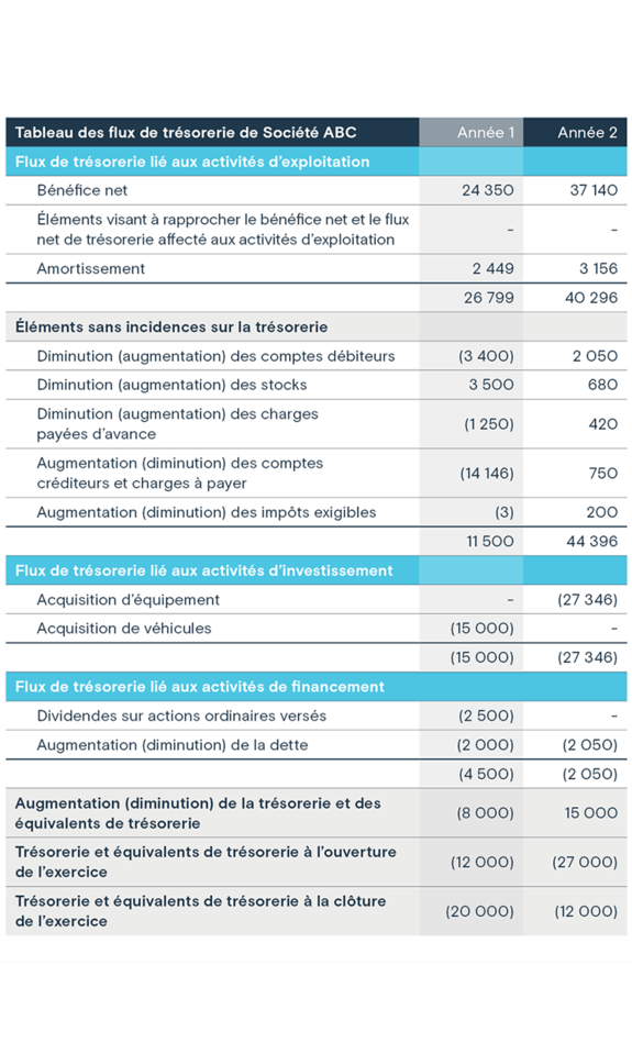 Bien que les flux de trésorerie disponibles ne figurent pas comme un poste dans les états financiers, les chiffres nécessaires pour effectuer le calcul se trouvent dans l’état de l'évolution de la situation financière (parfois appelé «état des flux de trésorerie») et l’état des résultats d’une entreprise. À l’aide de l’exemple de la société ABC ci-dessous, les flux de trésorerie disponibles sont calculés comme suit la première année: