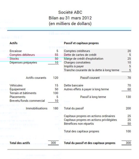Selon l’exemple de bilan ci-dessous, la société ABC calculerait son ratio de liquidité relative comme suit: