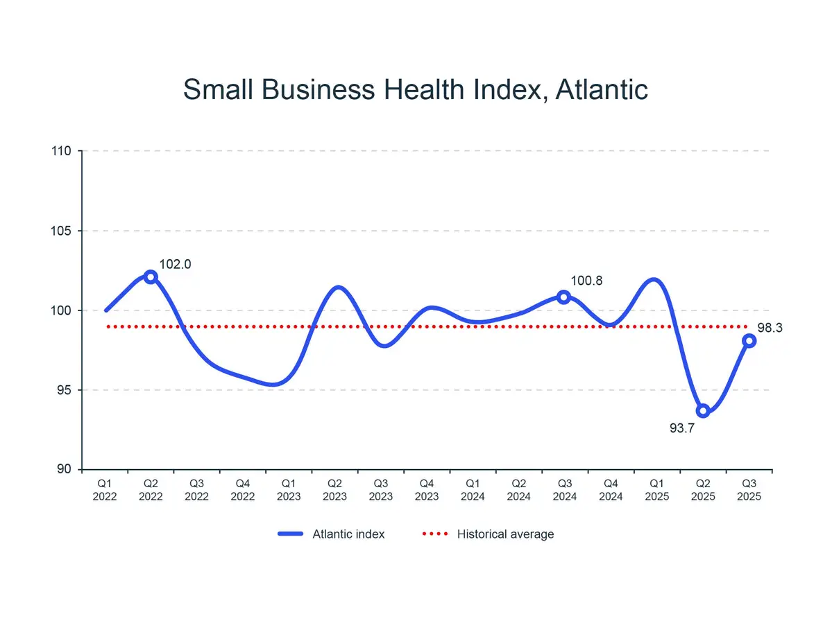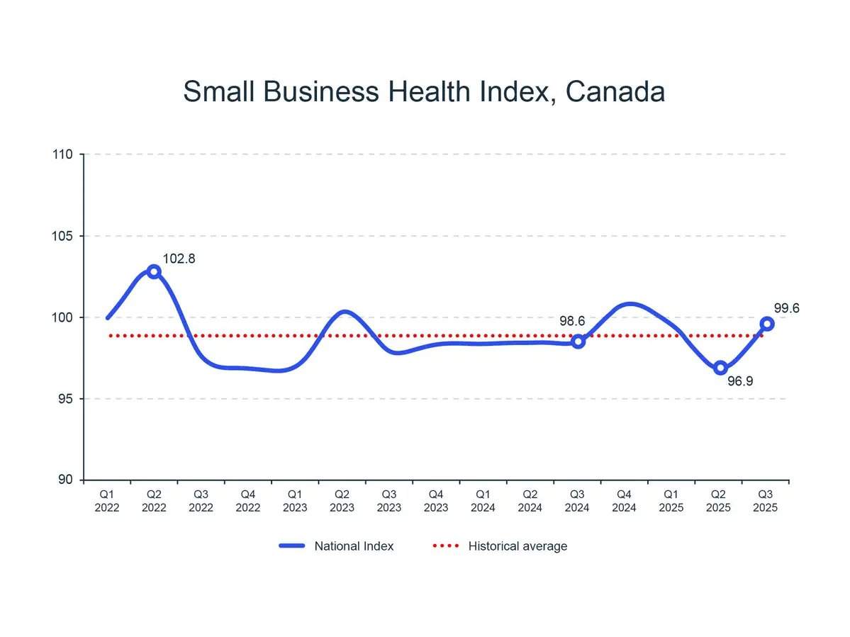 The national index climbed to 99.6 in Q3 2025, a 2.8% increase from the previous quarter. While uncertainty remained elevated, consumer fundamentals were solid—employment held up despite weakness in the manufacturing sector. The Canadian economy also showed resilience to tariffs, which helped restore some confidence among entrepreneurs.