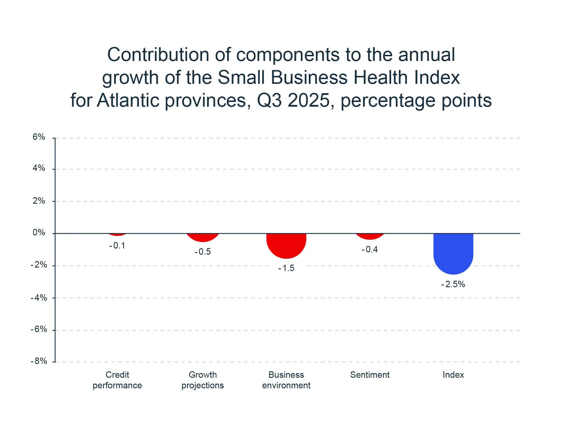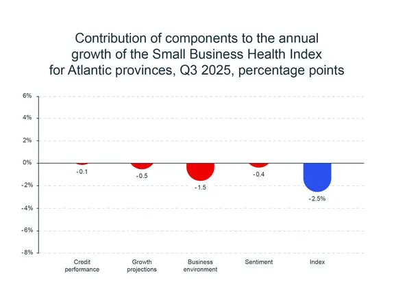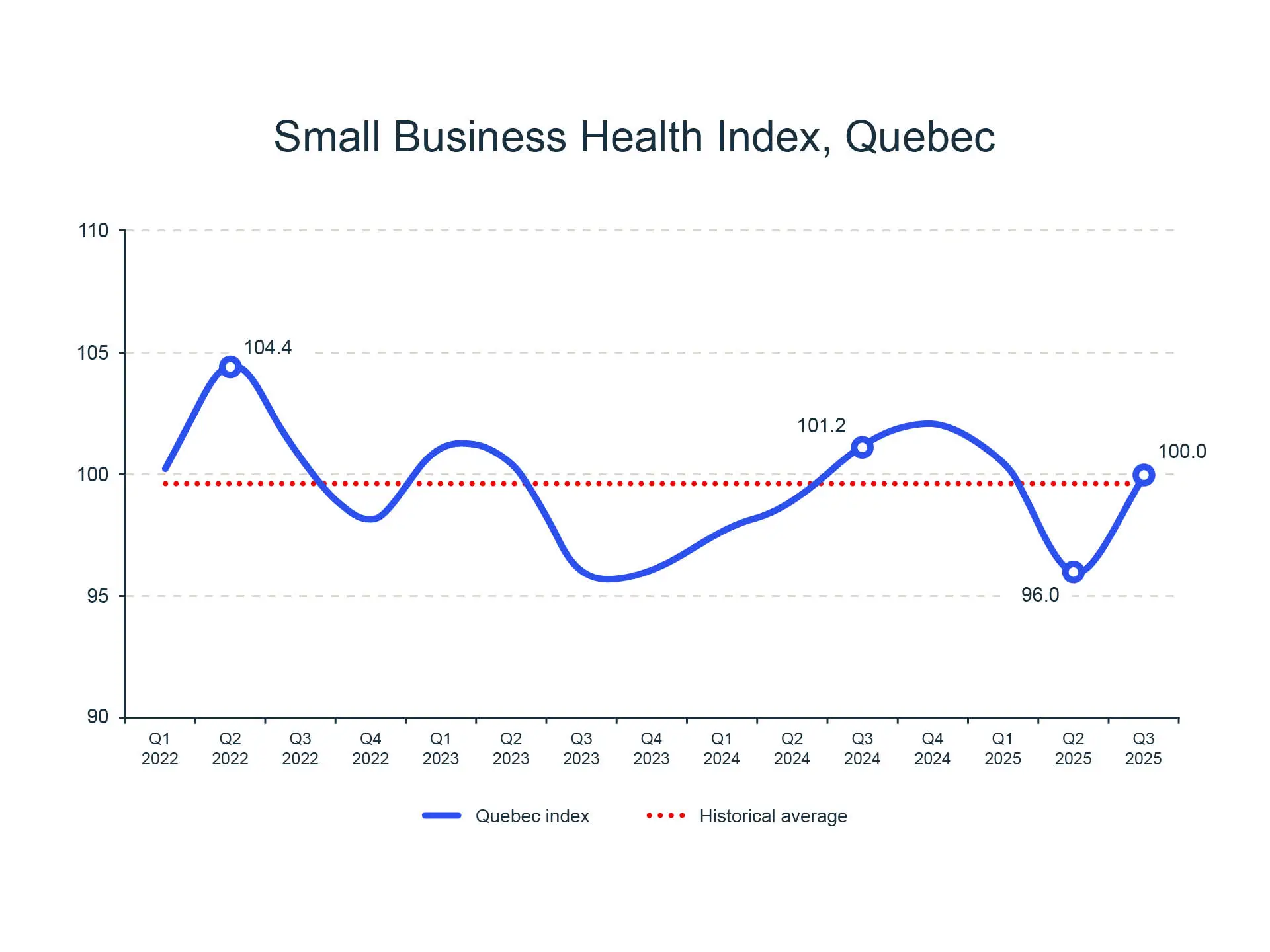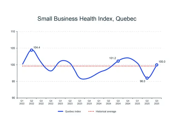 The Quebec index stood at 100 in Q3 2025, reflecting a 4.2% quarterly increase but a 1.2% decline compared to the same period last year. Quebec remains directly exposed to tariffs, particularly on aluminum and softwood lumber. While the current outlook and financial health of SMEs have improved compared to Q2 2025, when uncertainty was at its peak, they remain weaker than they were at this time last year. In short, businesses continue to face headwinds, and confidence remains tepid.
