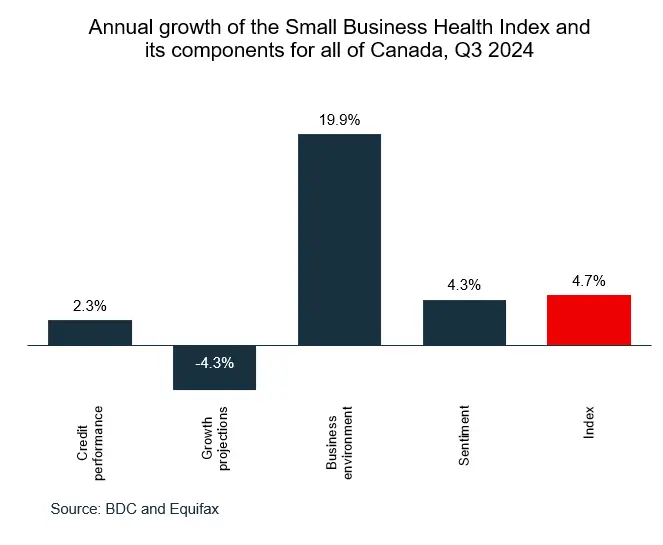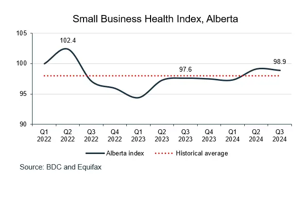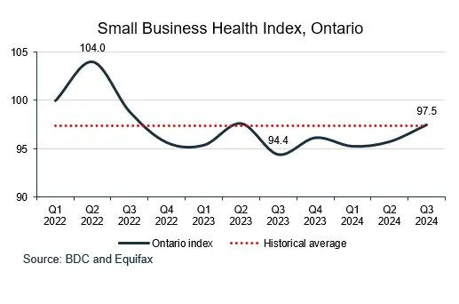 The health of Ontario small businesses has been improving since the beginning of 2024, reaching 97.5 in Q3 2024—growing by 3.2% year-over-year and 1.8% over the previous quarter.
