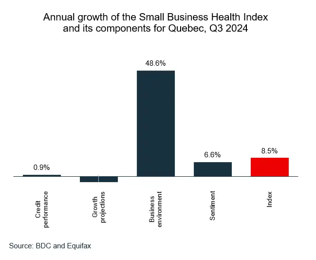Business health in Quebec showed strong increase in Q3 2024 following a stagnant GDP in 2023. Overall, the index stood at 100.0, an 8.5% increase compared to a year ago and a 3.2% increase against the previous quarter.
