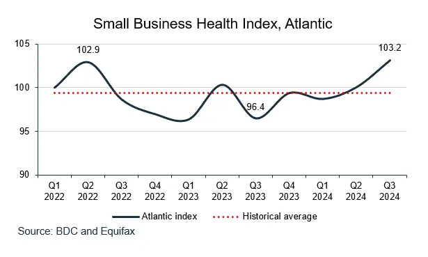 The Atlantic region outperformed the national index in Q3 2024. It stood at 103.2, posting a 7.0% increase over the same period last year and a rise of 3.1% over the previous quarter. The credit performance of businesses in the region improved while early delinquency rates decreased. There was also stronger employment and wage growth in these provinces, contributing to the strong rise of the business environment component. This also seemed to impact business sentiment, as SMEs had a more optimistic economic outlook.