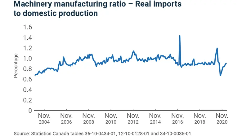 Food production, for one, has seen years of steady growth in domestic production, boosted by Canadian trade deals with the European Union and Pacific Rim countries. The industry saw a decline in the import-to-domestic production ratio from 2016 to 2018, but the ratio then reversed course and has fluctuated significantly during the pandemic.