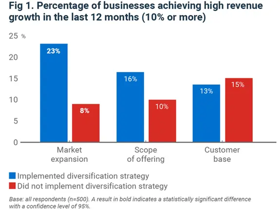 Overall, 16% of businesses that were diversified […] experienced high growth. […] This compares to just 8% of undiversified businesses that achieved high growth.