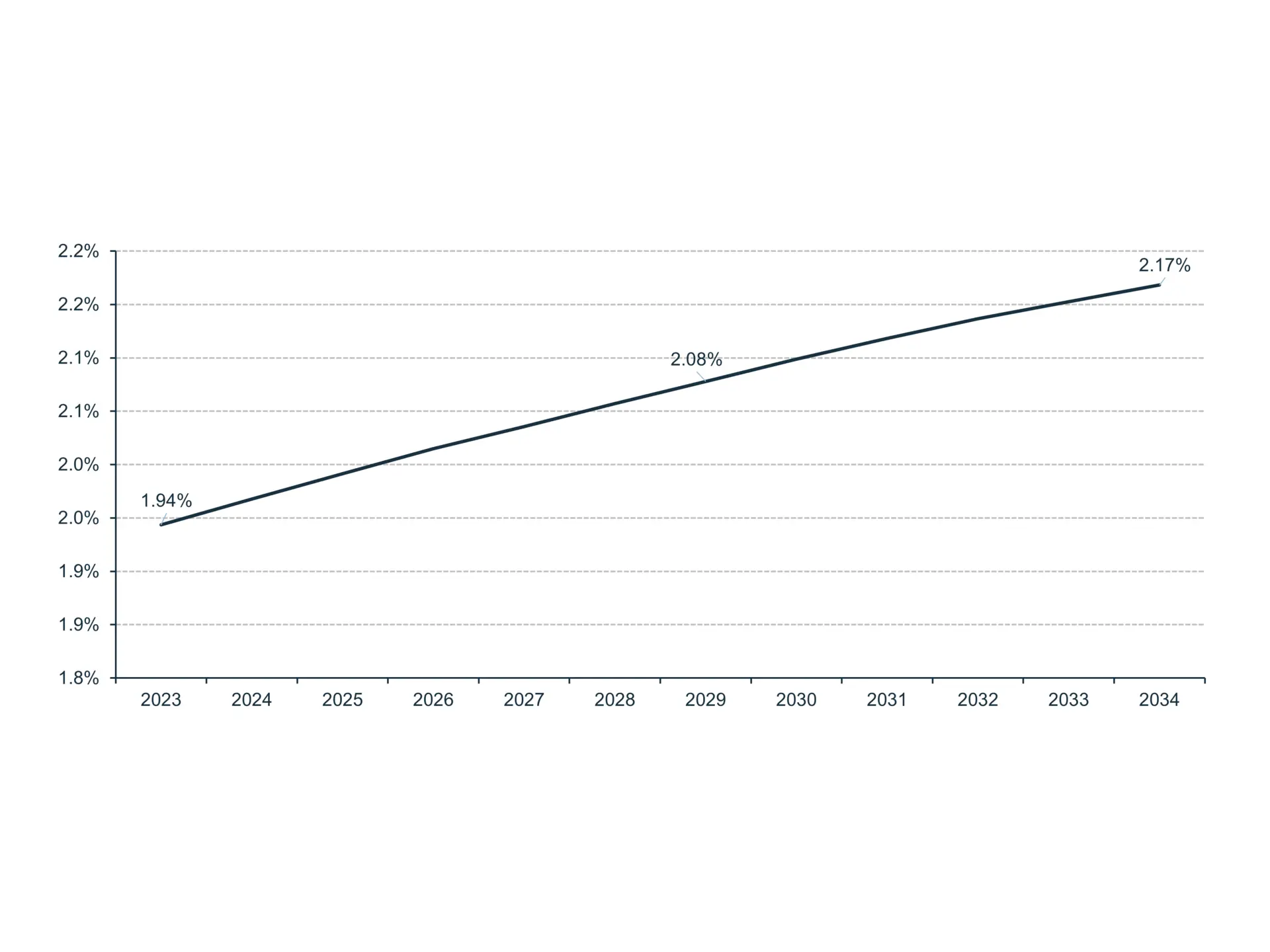 Reading grid: This graphic shows that the share of Indigenous entrepreneurs in Canada is forecasted to grow from 1.94% in 2023 to 2.17% in 2034.