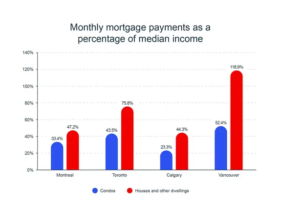 This graph illustrates the percentage of average income allocated to mortgage payments in four major Canadian cities.