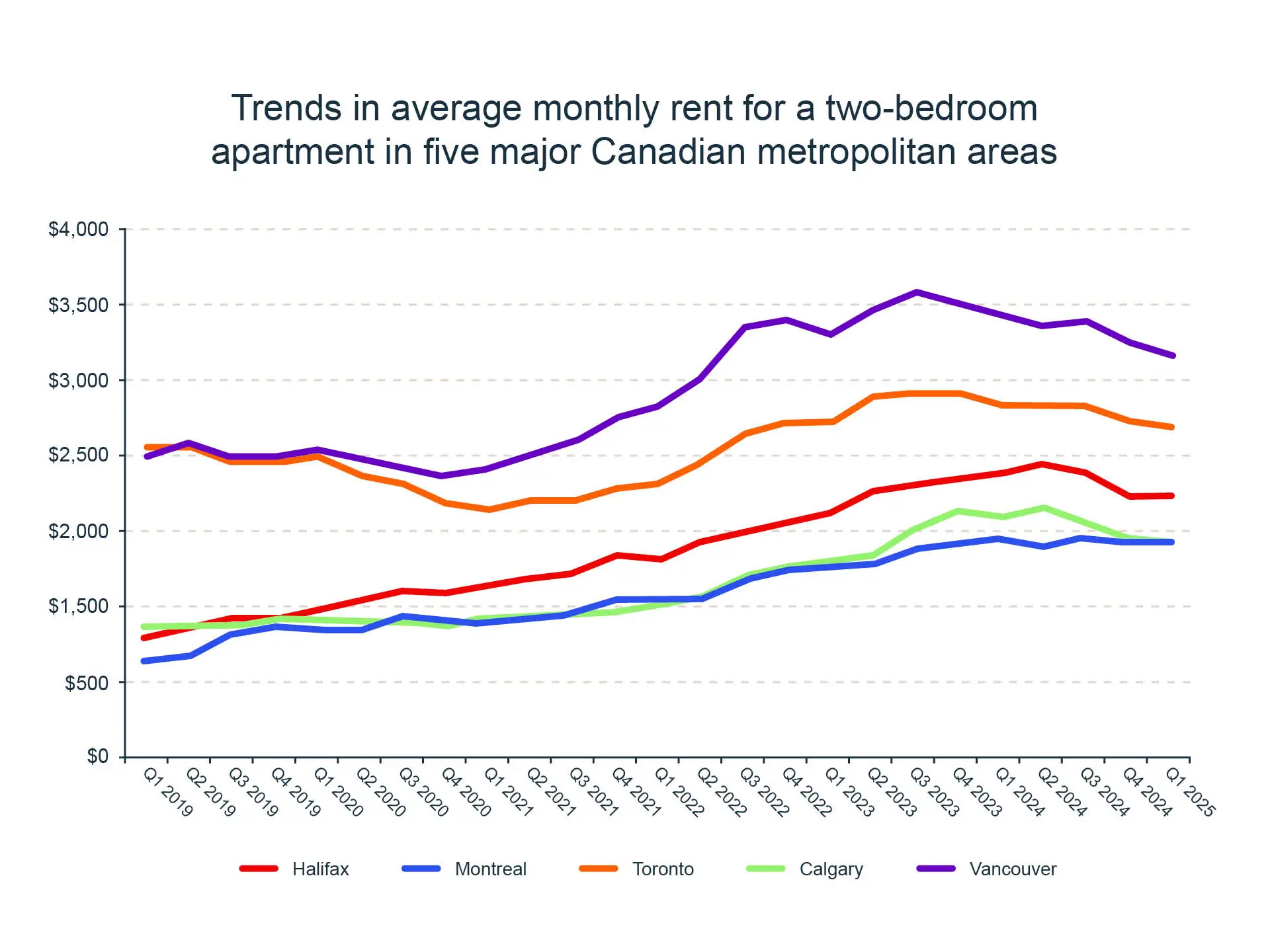 Trends in average monthly rent for a two-bedroom apartment in five major Canadian metropolitan areas