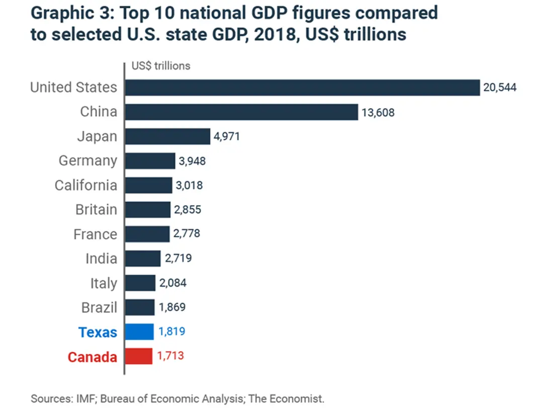 There is another possibility we must consider. That the Canadian market structure makes it harder for Canadian companies to grow. After all, Canada is a big country, but a small market. Our GDP is lower than it is for the state of Texas (Graphic 3).