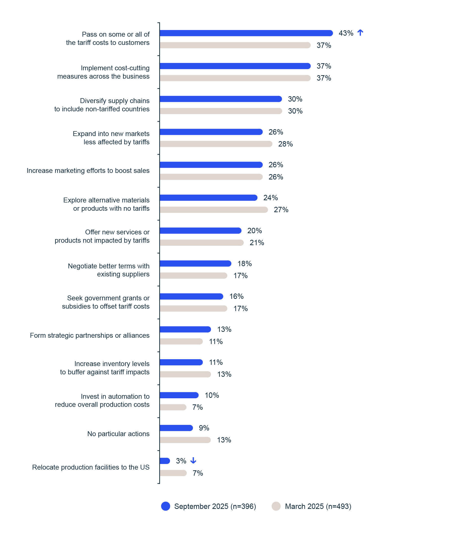 The survey found that the vast majority of businesses (91%) have taken or plan to take steps to manage tariffs. The top three strategies were: