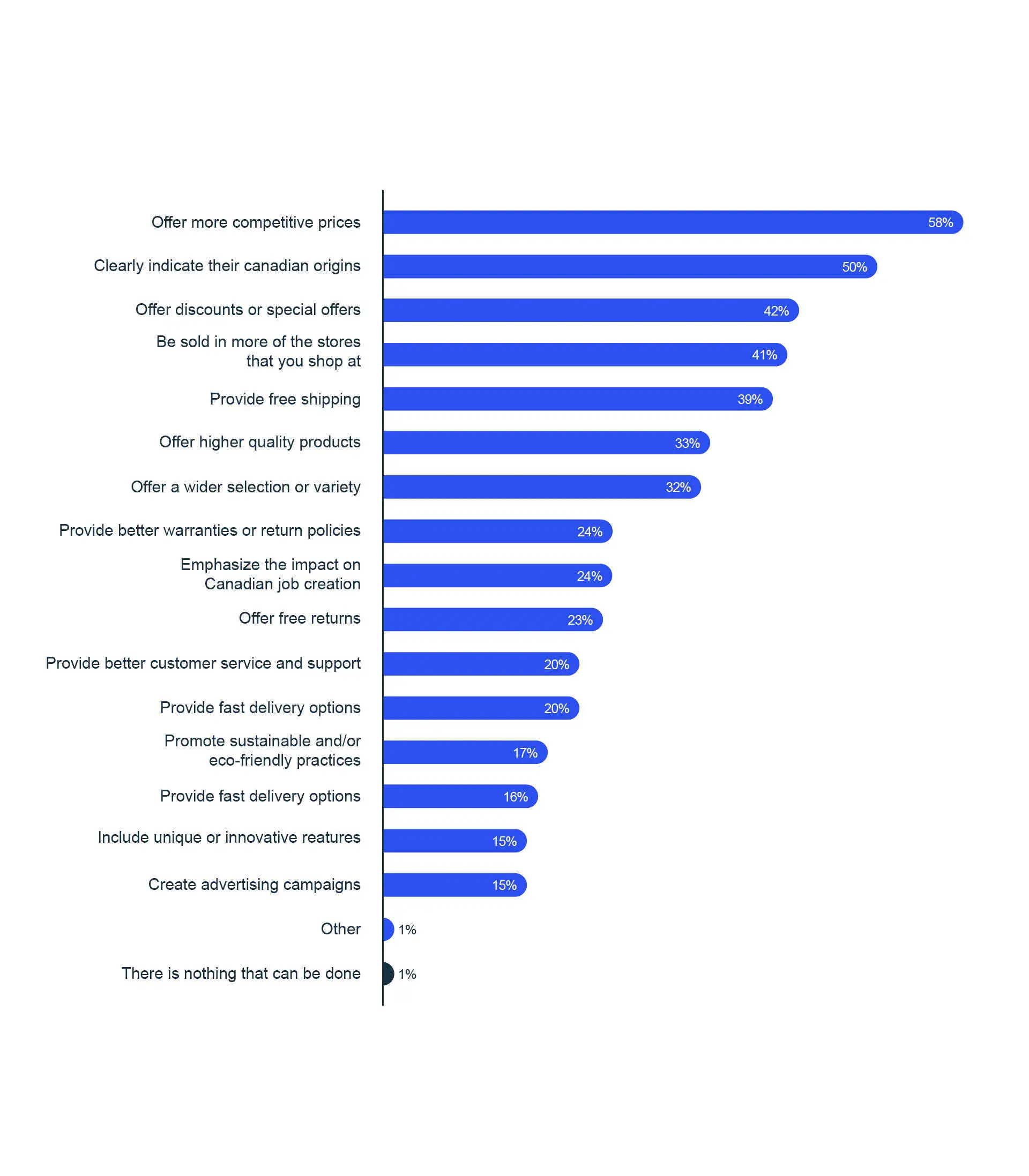 - When asked what Canadian businesses could do to earn more of their business, consumers' top answers were straightforward: offer more competitive prices and clearly indicate Canadian origins.