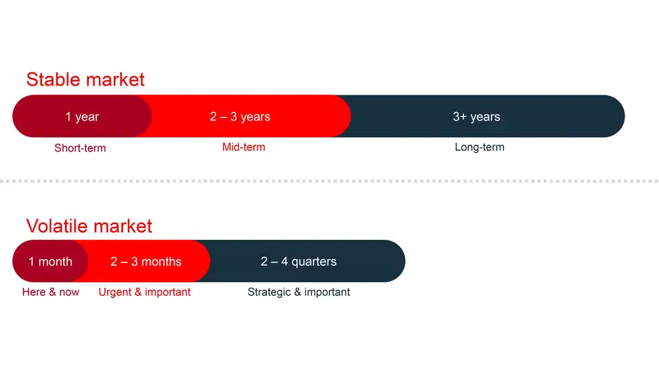 In a normal business cycle, you clearly understand the playing field, which is relatively unchanging. You can plan firmly for the next year, while your mid-term plan will include more assumptions and your long-term plan will rely more on trend analysis.