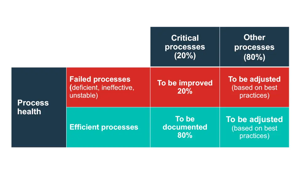 Not all the company’s processes need to be optimized for a successful digital transformation to take place. Most of the key activities are already working well most of the time. It is better to focus on the 20% of processes that are critical – those that are the most visible and that create the most value for the customer.