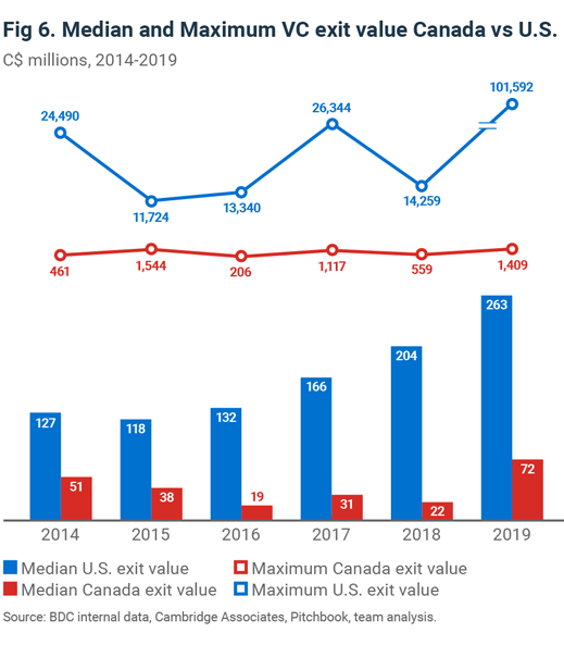 While there remain challenges, Canada’s VC industry has shown much stronger exit performance in recent years. The median exit size increased 3.8 times from 2016 to 2019 (Fig.6). Meanwhile, the time to exit from first funding reached parity with the U.S. at 6.1 years over the 2014-2019 period.
