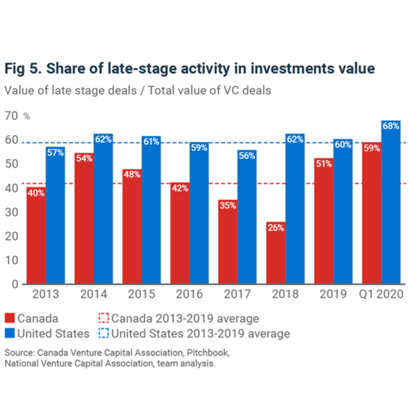 The proportion of late-stage VC deals in Canada has increased markedly since 2017. This means established Canadian tech firms are benefitting from better support for their growth ambitions here and abroad. The share of Canadian VC investments that are late stage now rivals that of the U.S. in numbers (Fig.4). However, Canada still lags the U.S. in aggregate value (Fig. 5).
