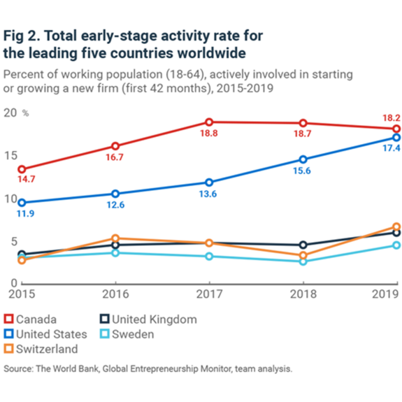 That commitment, combined with other efforts to foster business creation, has allowed Canada to record the highest rate of early stage entrepreneurship among major developed countries in every year since 2015 (Fig. 2).