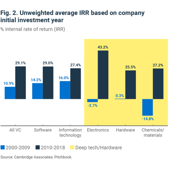 At the same time, returns within deep tech have drastically improved since 2010 (Fig. 2.). Whereas from 2000 to 2009 deep tech and hardware investments lagged behind the VC asset class as a whole, they have since either outperformed or performed in line with the VC asset class.