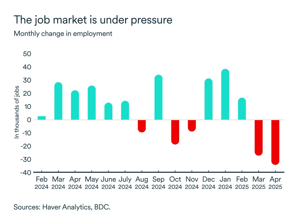 There were job losses in sectors that are more vulnerable to tariffs, such as manufacturing (-12,200), construction (-7,400) and transport and warehousing (-15,500).