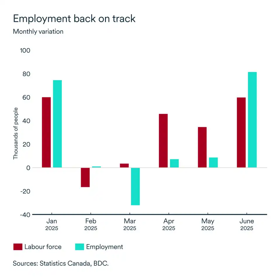 - The likelihood that the Bank of Canada will hold its key rate steady at 2.75% offers monetary stability for businesses. The rate cuts over the past year (-225 basis points) combined with reduced economic volatility could lead to lower effective interest rates for businesses and households. This, combined with the upturn in employment in June, could revive demand for goods and services even further.