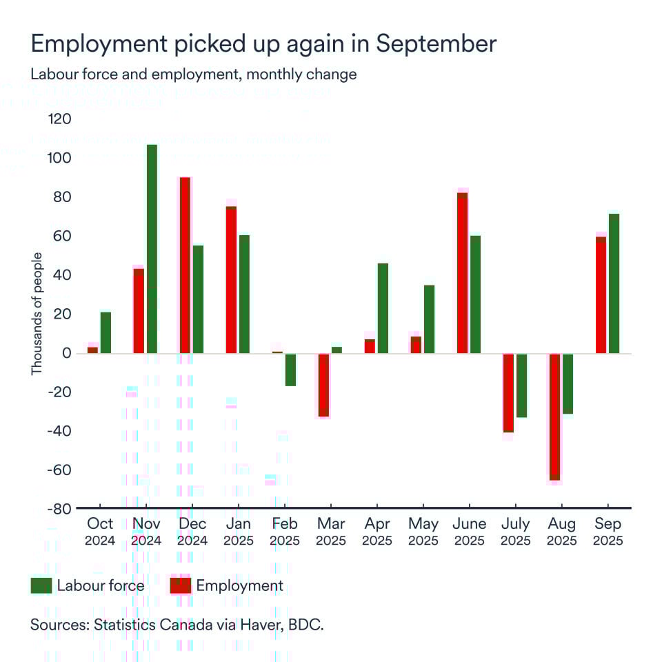In September, 60,400 jobs were created in Canada, after a cumulative loss of 106,000 jobs in the previous two months. A significant portion of the September job gains were generated by the private sector (+22,000 ), which suggests businesses are gradually regaining their footing. In other good news, employment picked up in sectors more vulnerable to tariffs where there have been significant losses since the start of trade tensions.