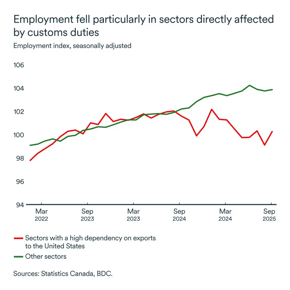 Before unexpected job gains in September (+40,700), sectors with a high dependence on exports to the U.S. had lost more than 100,000 positions since January. The Bank of Canada estimates that nearly two million jobs in the country depend on U.S. exports.