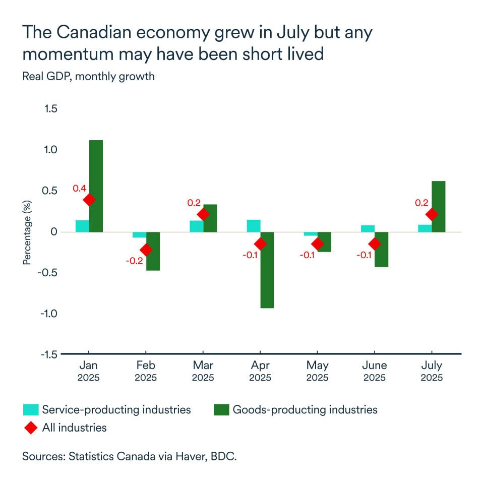 After three months of decline, the Canadian economy returned to modest growth in July (+0.2% real GDP), thanks to gains in service sectors, and more reassuringly, in goods-producing industries, according to Statistics Canada.