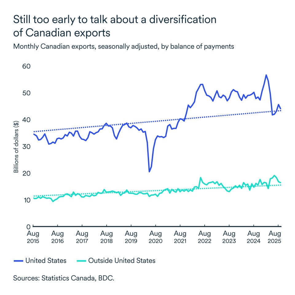 While export diversification remains limited, imports from countries other than the U.S. continue to rise, suggesting that Canadian companies may be finding it easier to diversify their suppliers than their customers.