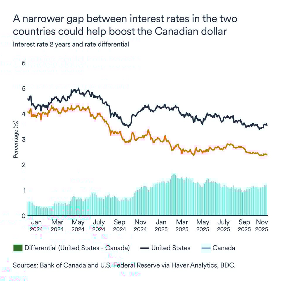 We expect the Canada-U.S. short-term rate differential to narrow in 2026, with the impact being modestly in favour of a stronger Canadian dollar.