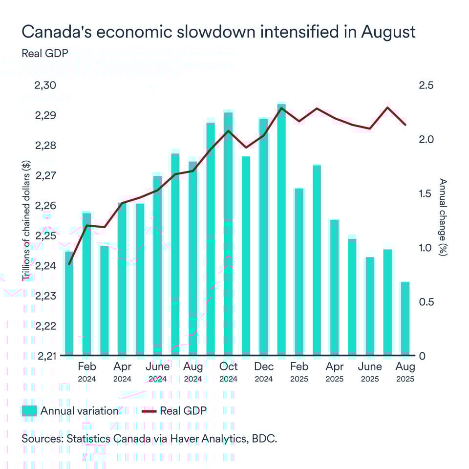 In the first eight months of the year, the Canadian economy grew by 1.3% compared with the same period in 2024. Considering the headwinds buffeting Canada, the chances the economy will slow further in the fourth quarter remain important, although some leading indicators point to resilience in the economy.