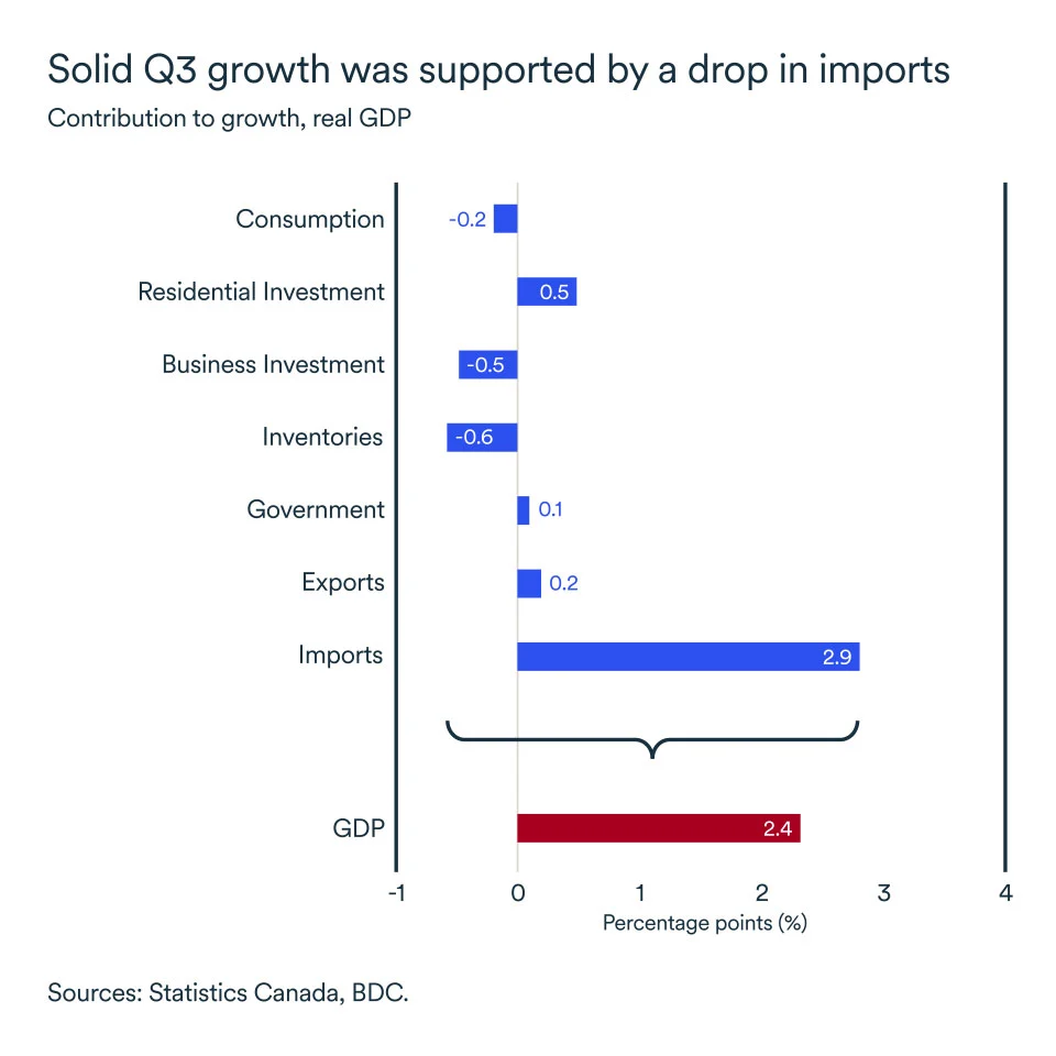 n addition, businesses (and households) have reduced spending outside the country. Imports declined so significantly that it accounted for most of the growth in Q3. The decline in imports alone contributed to a 2.9-point increase in real GDP growth compared to Q2.