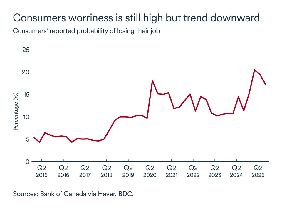 Consumer spending is being held back by weak population growth and a lack of confidence in the outlook for the economy. Some measures of consumer confidence showed a slight increase in November, but they remain below 2024 levels. Close to one in five workers still fears losing their jobs, according to the Bank of Canada. This level is similar to that in the second quarter of 2020, when the pandemic forced a widespread economic shutdown.
