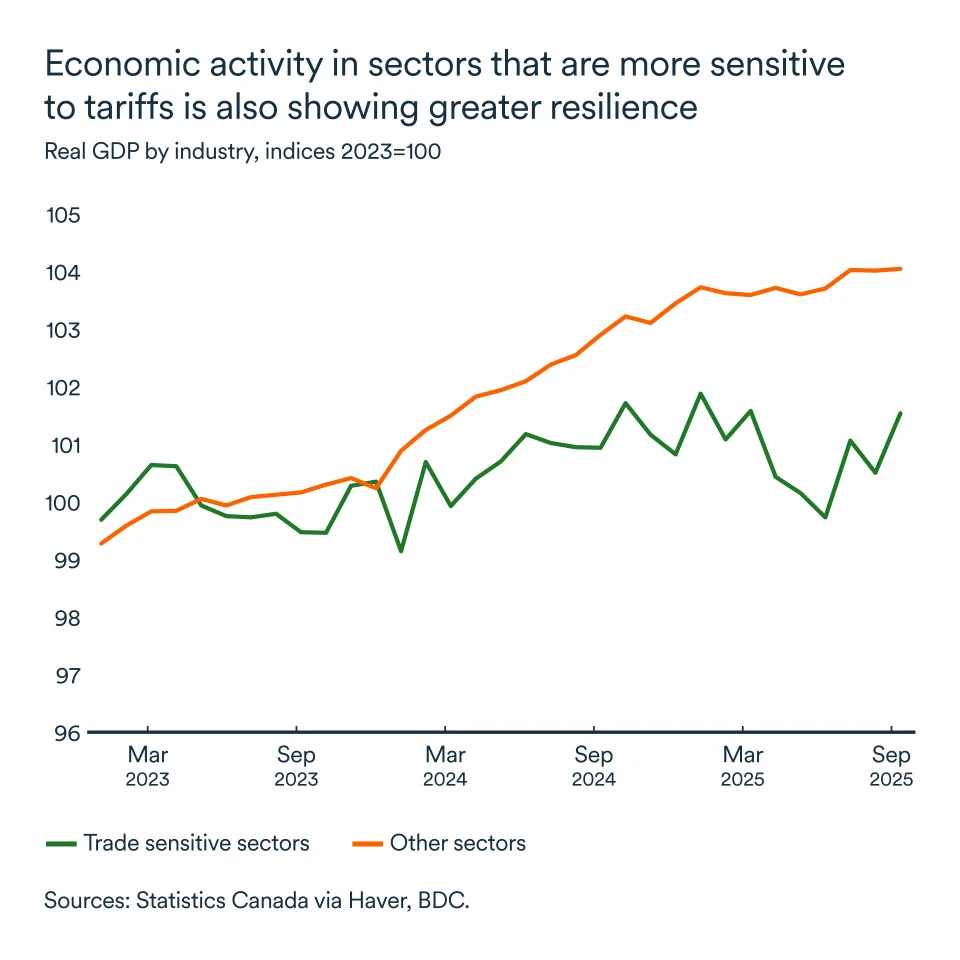 The sectors most affected by trade tensions showed signs of adjustment at the end of 2025, and other parts of the economy remained stable. A surprising 26,200 jobs were created in export-dependent sectors over the year, while the rest of the economy generated 192,000 more. Sectors that are more sensitive to international trade experienced sluggish growth (0.2%), while the others chugged along at a steady pace (1.5%).