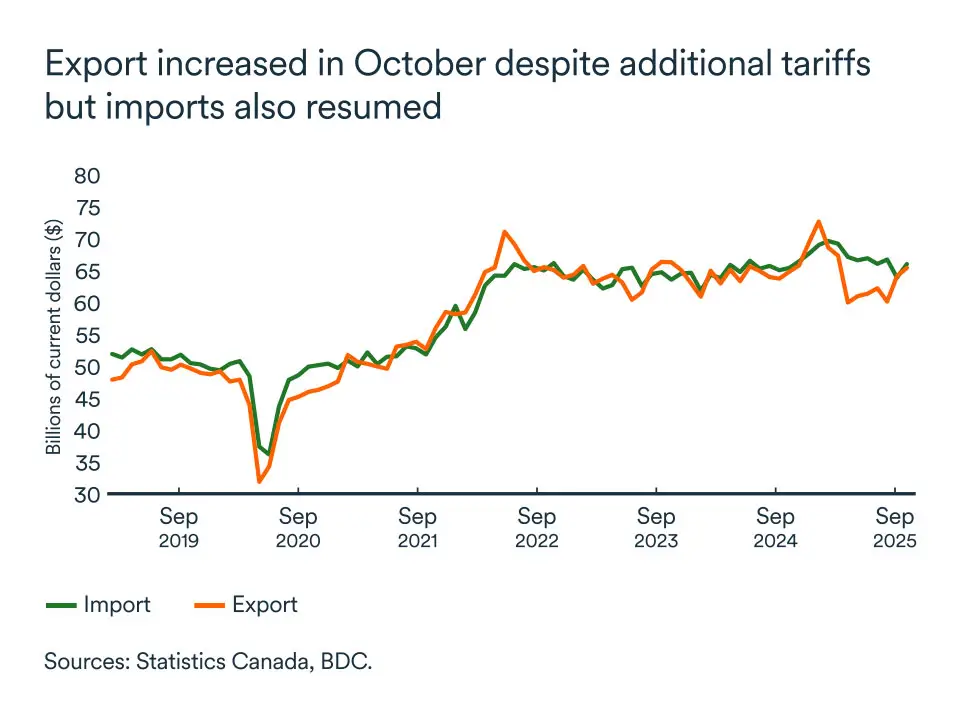 Trade remains the wild card for Canada's economic outlook. Following high volatility earlier in the year, October data brought no clarity about the future direction of trade. Exports rose 2.1% to $65.6 billion, while imports jumped 3.4% to $66.2 billion, tipping the trade balance from a slight surplus in September to a deficit in October.