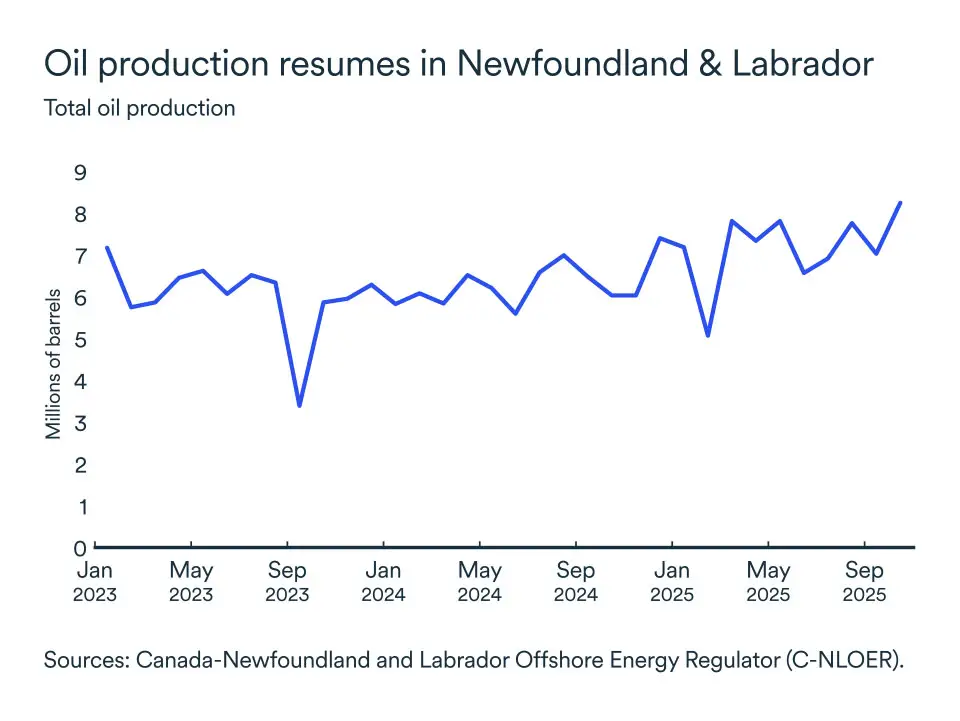 Oil production was a big driver for the province’s economy in 2025, increasing by 37% in October alone (year-over-year). While oil prices hit new lows, weighing on revenues, increased production should continue to support growth this year.