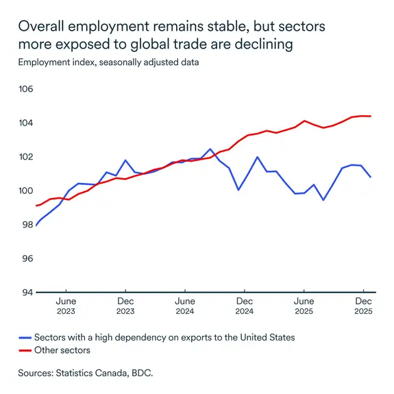 In sectors that are highly dependent on international trade and are particularly exposed to tariffs, employment had stabilized in 2025, but at a level below that seen before the trade crisis began.