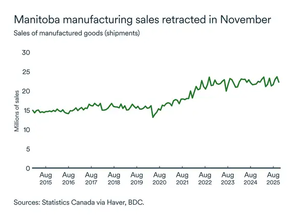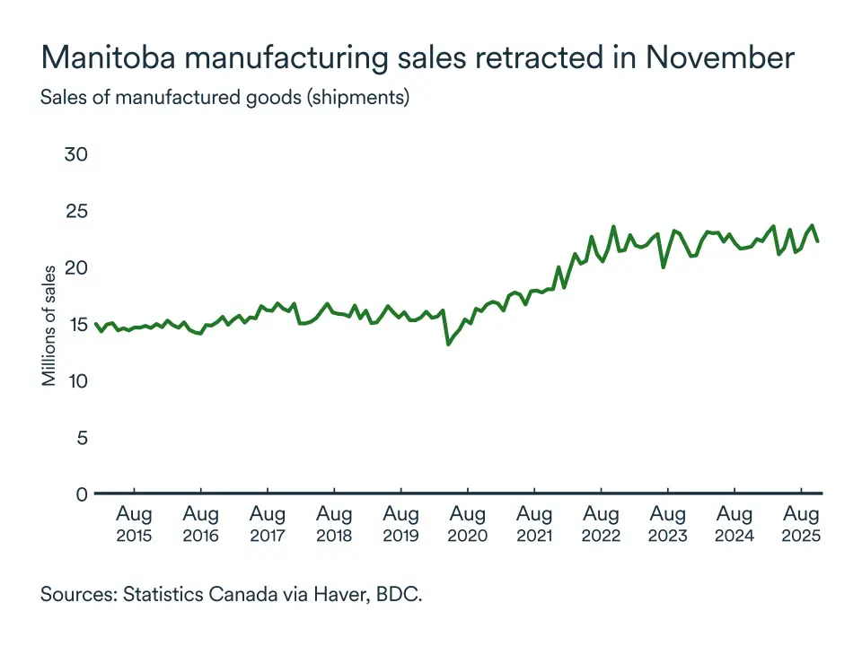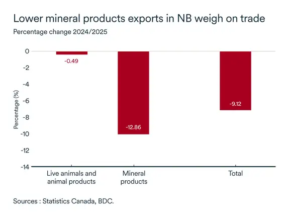 Exports remained under pressure in New Brunswick, dragged down by mineral products. Weakness in trade directly impacted the manufacturing sector, where sales were down 6.5% in 2025.