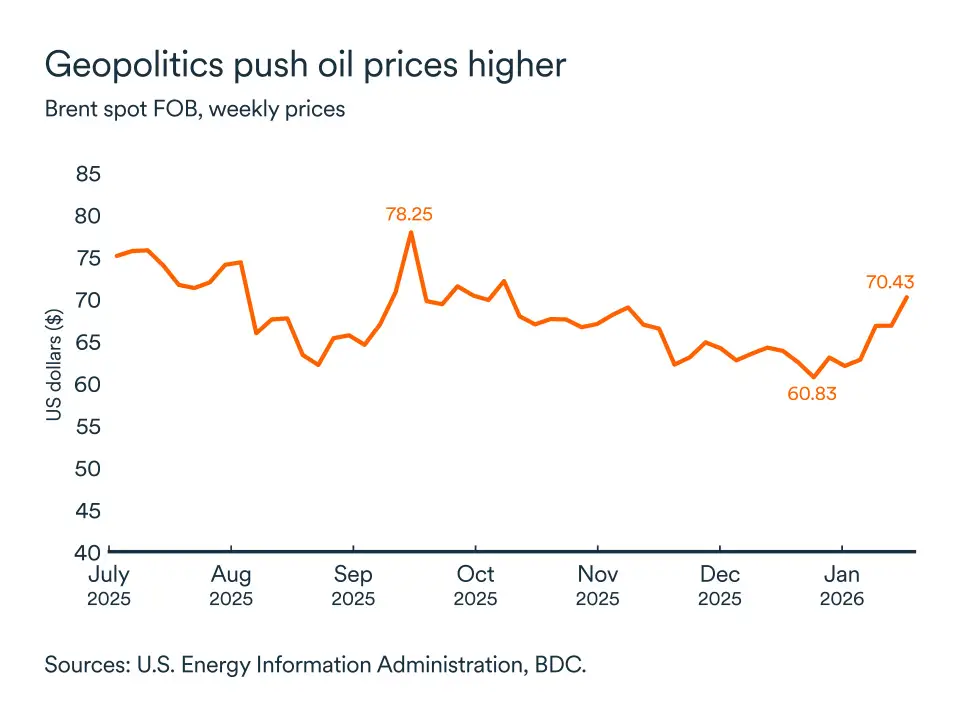 Geopolitical tensions in South America and the Middle East have put upward pressure on oil prices. A recent surge in prices is expected to continue as long as tensions in the Middle East remain elevated. However, fundamentals should cap oil prices because supply still exceeds demand.