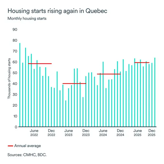 Following two years of slow homebuilding, housing starts are rising in Quebec, reflecting a favourable environment for residential construction, despite slower population growth. Building, especially of rental units, has been stimulated by a combination of strong rent increases in 2025 and relatively lower construction costs.
