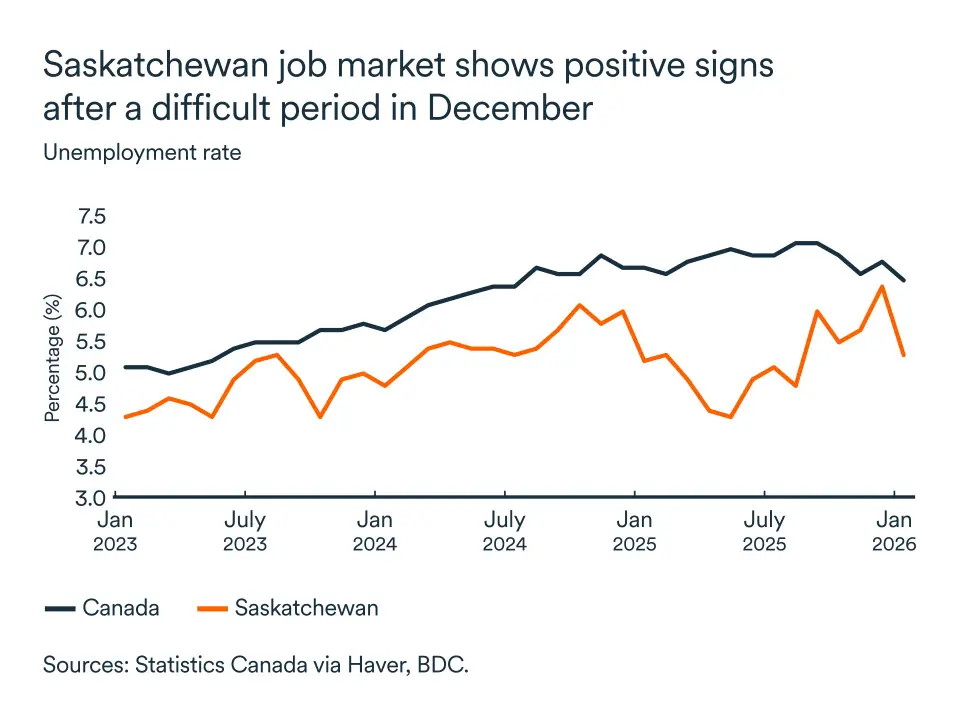 The labour market improved markedly in January with the addition of 15,000 jobs. Unemployment fell to 5.3% from 6.4% in December. This gave Saskatchewan the second-lowest unemployment rate in the country.
