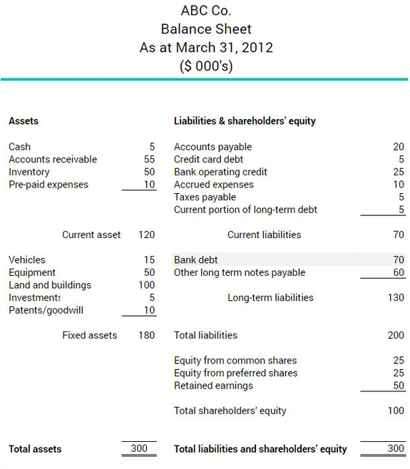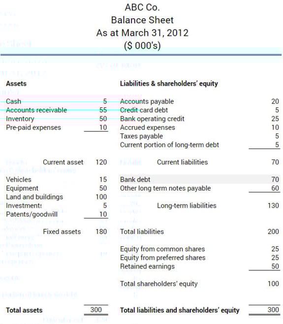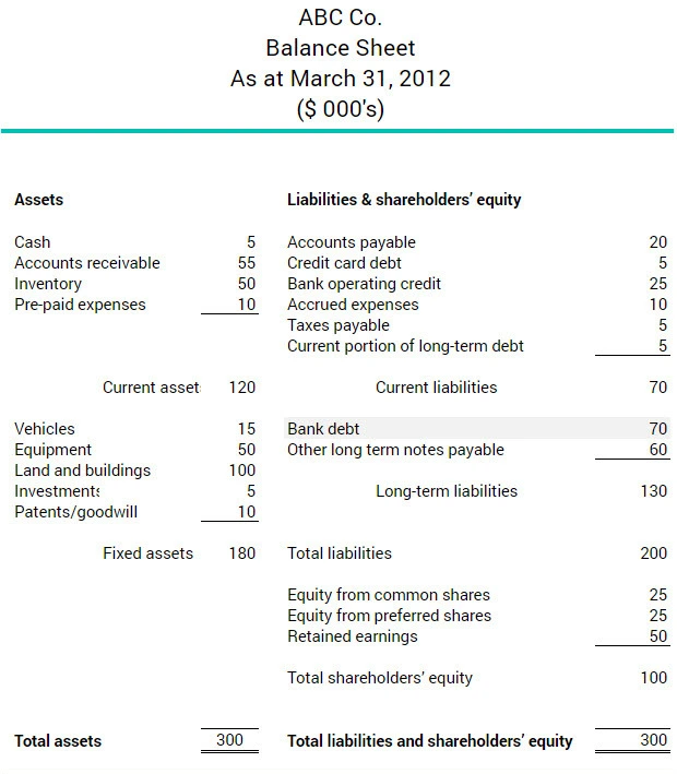 The balance sheet below shows that ABC Co. had $70,000 in bank debt on March 31, 2012. With $180,000 in long-term assets and $130,000 in long-term debt, the company has a healthy ratio of long-term assets to long-term debts (it has $1.40 for every $1 it owes).