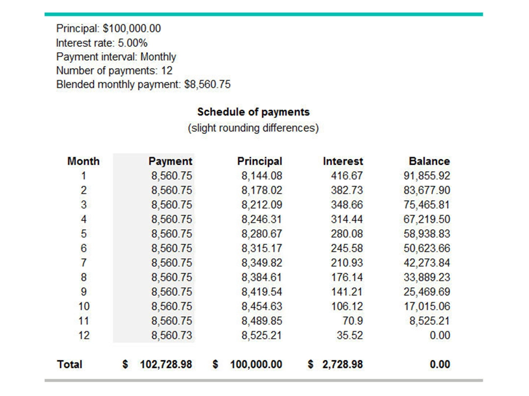 In the example below, ABC Co. has a $100,000 loan with a 12-month amortization period and a fixed interest rate of 5%. As can be seen, the amount of interest paid gets lower over time, while the amount of principal paid increases. The payments are the same each month.