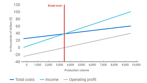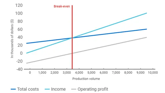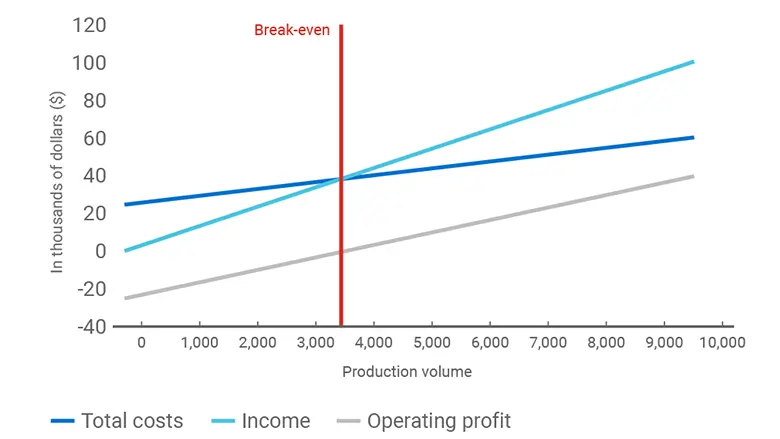The break-even point is when total costs are equal to total revenue. Below that point, you’re operating at a loss; above that, you’re earning an operational profit.