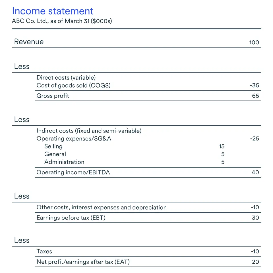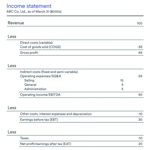 The income statement below shows that ABC Co. earned $100,000 in revenue by selling 10,000 units at $10 per unit. The gross margin percentage is 65% and the company’s total indirect costs are $25,000.