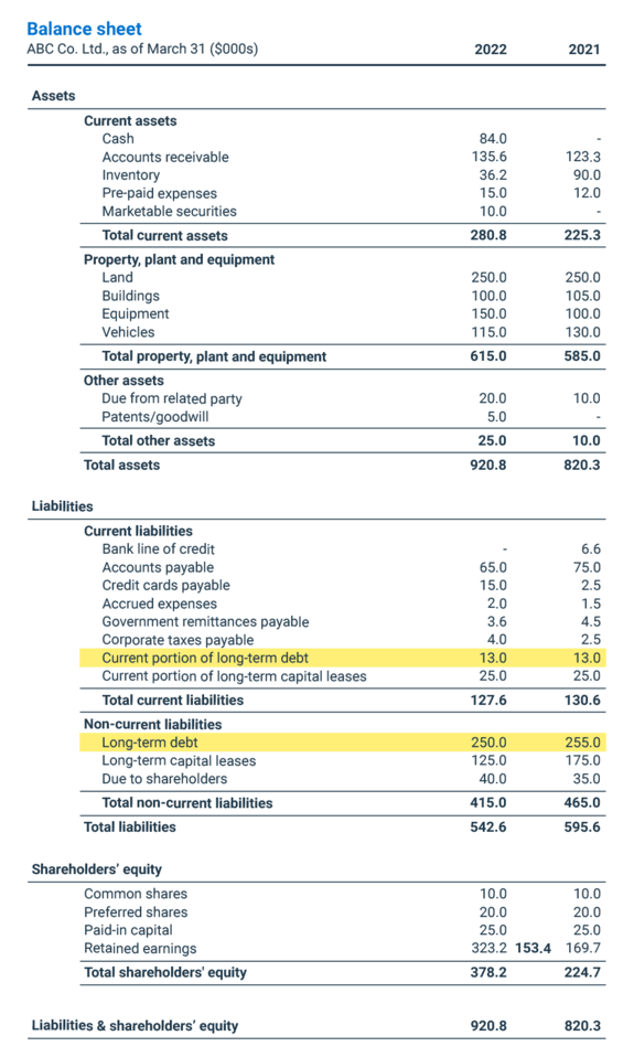 On the sample balance sheet below, the lines for long-term debt and the current portion of long-term debt are highlighted in yellow.