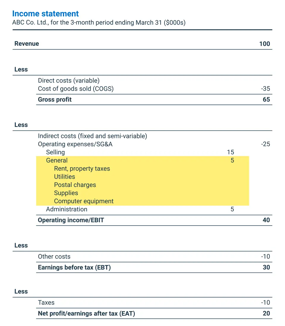 The graphic below shows where general expenses appear on a company’s income statement and how they are used to calculate total costs, and earnings before interest and taxes.