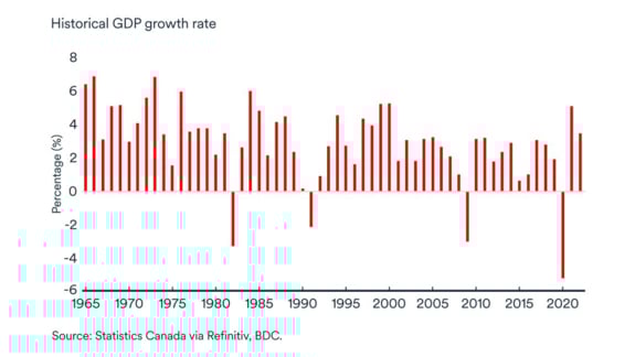 Canadian GDP growth has varied widely through the years. The chart below gives an overview of Canadian GDP growth between 1965 and 2022.