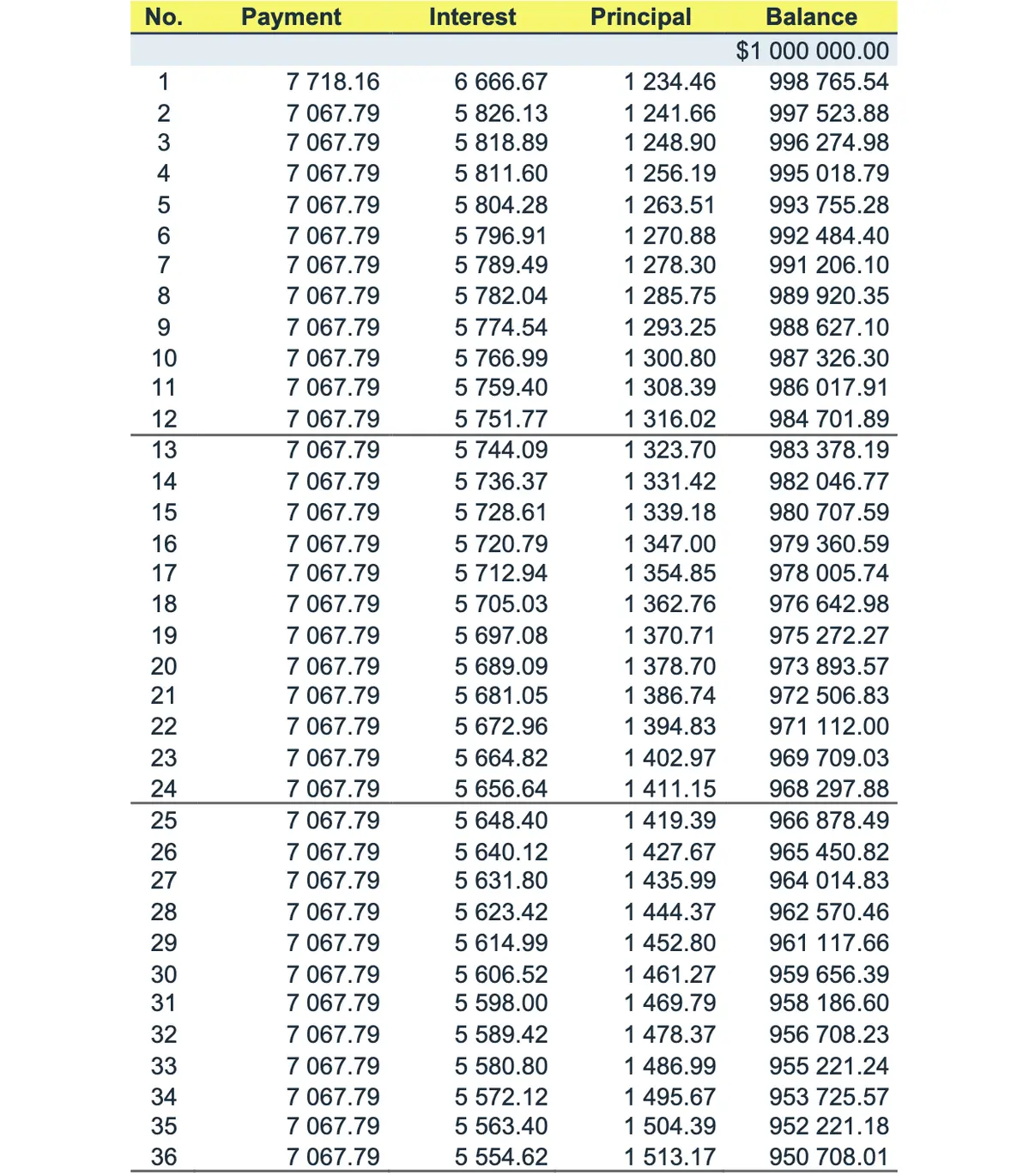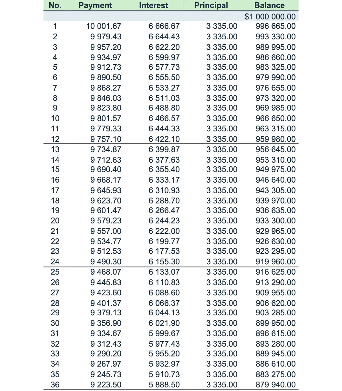 Monthly payments = Principal (Loan ÷ Number of periods) + Interest (Outstanding balance x (Interest rate ÷ 12))