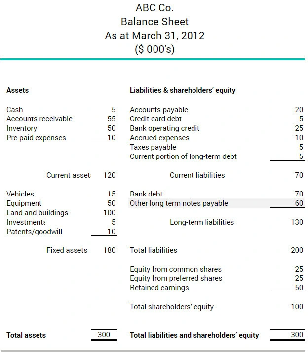 The balance sheet below shows that ABC Co. owed $70,000 in bank debt and $60,000 in other long-term notes payable as of March 31, 2012. The company has $1.40 in long-term assets ($180,000) for every $1 in long-term debt ($130,000); this is considered a healthy balance.