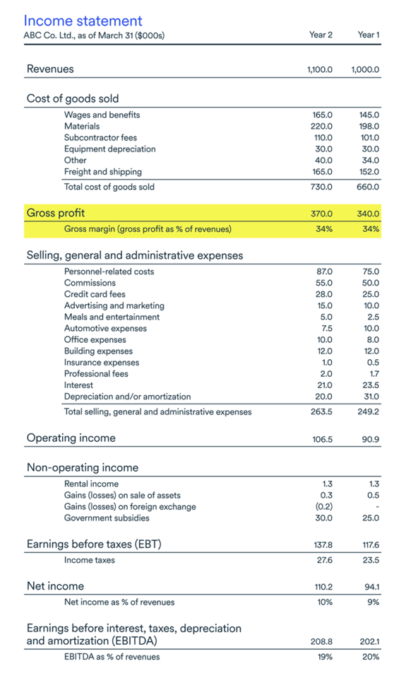 For example, in the sample income statement below, in Year 2, ABC Co. Ltd. had $1,100,000 in revenue, with a cost of goods sold of $730,000. In this case, the gross margin would be calculated as follows: