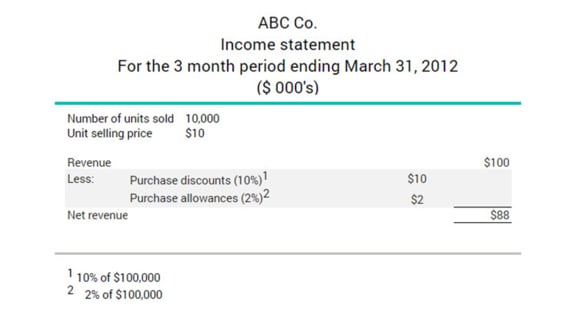 The excerpt below shows how purchase discounts and allowances are deducted from gross revenue on the income statement of a retail or wholesale company. In this case, ABC Company sells 10,000 units of its product at $10 each, with a 10% purchase discount and a 2% purchase allowance for customers.